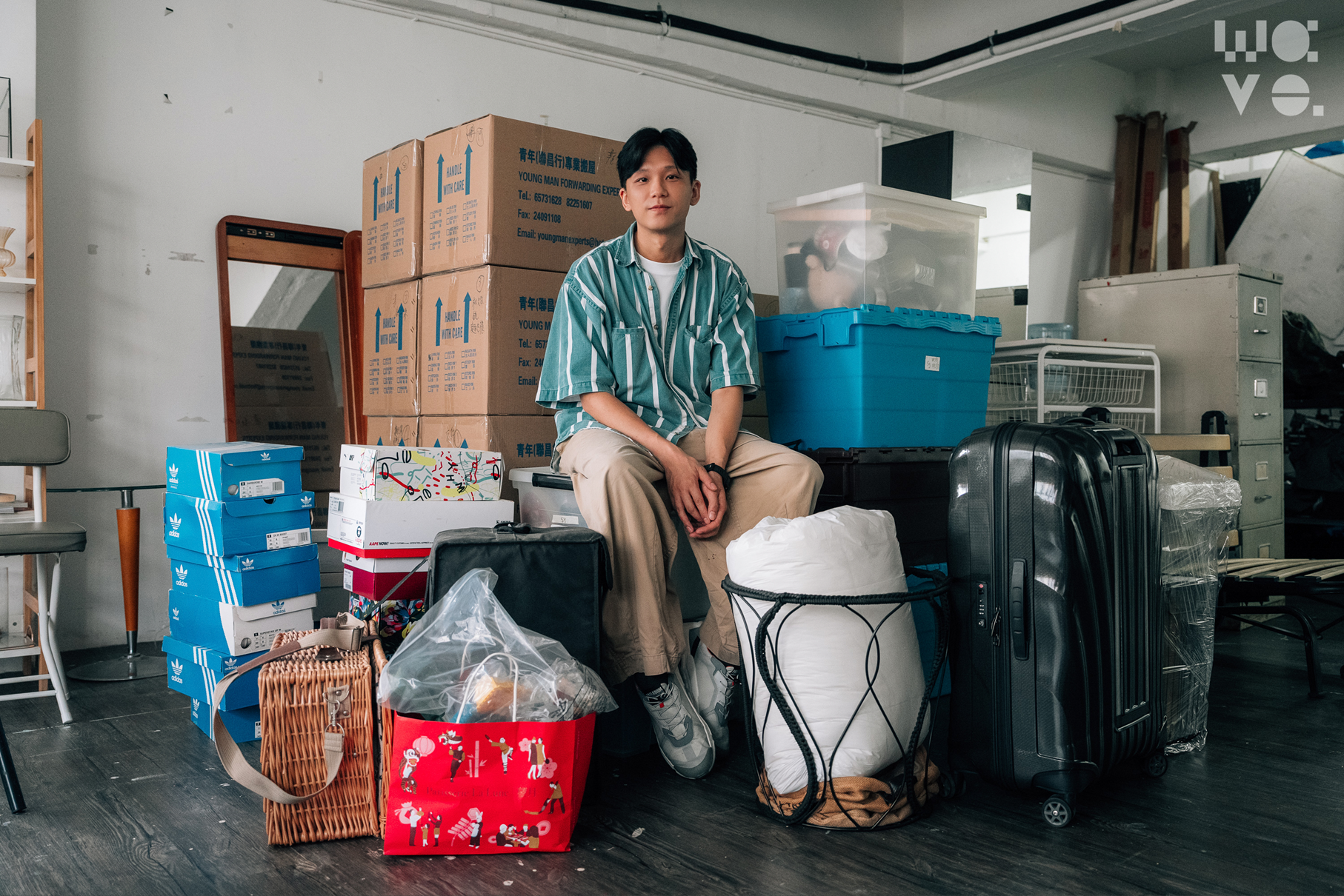 昏暗的 Studio 大廳中央擺了一大堆紙箱雜物,全是小野翌日要搬走的家當。他自嘲是「垃圾佬」、「拾荒者」性格,甚麼都捨不得扔,「每樣嘢,我都講得出點解會想佢留低。」